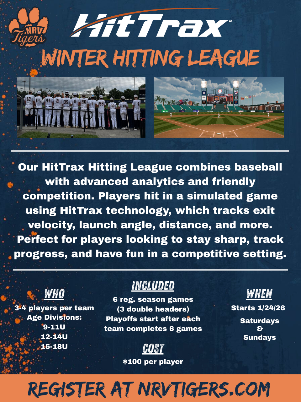 By registering for this league, players are able to access the NRV Tigers facility prior to their games to warm-up.